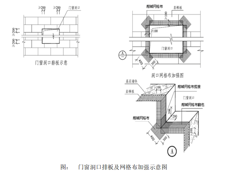 2)在外門窗洞口四角按45°方向加貼300×400mm的160級耐堿玻纖網布;
